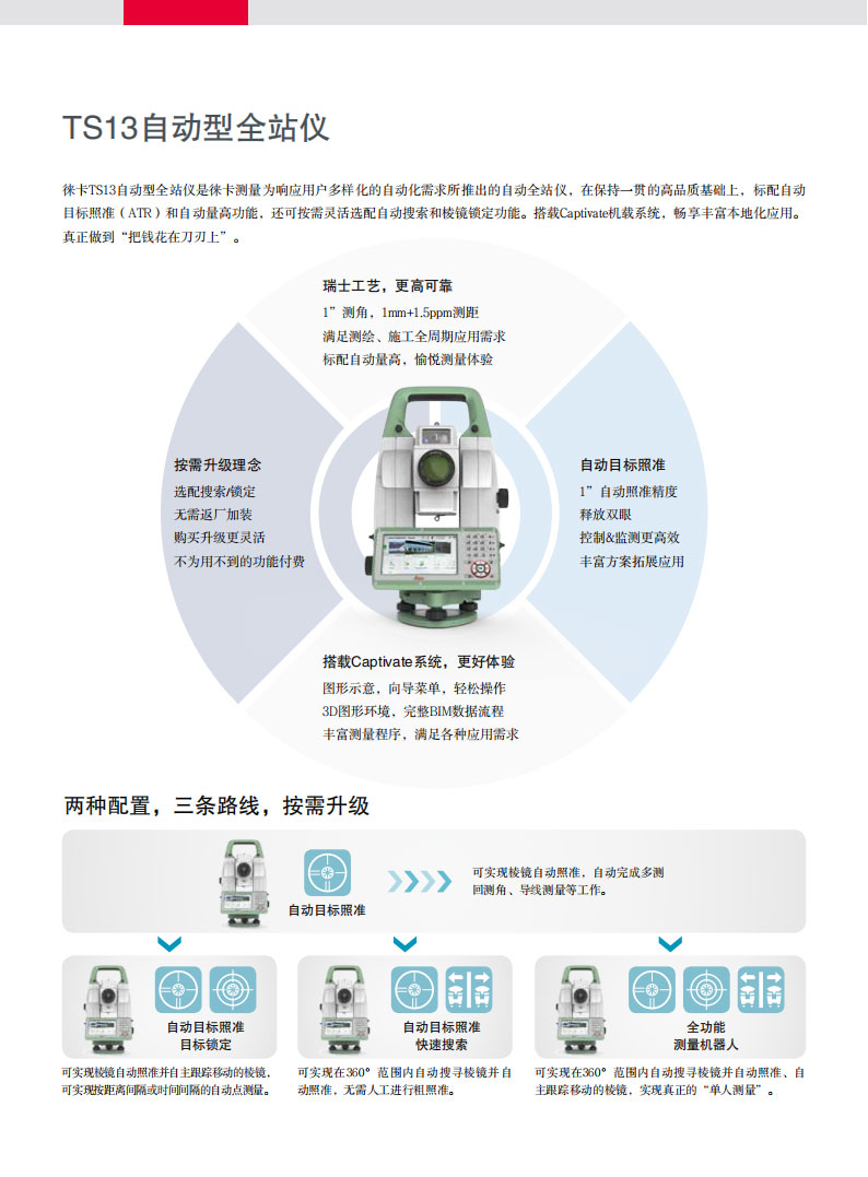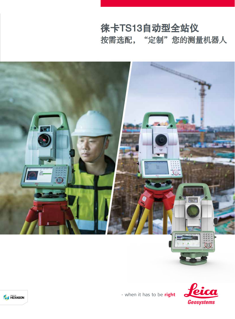 徠卡TS13自動型全站儀是徠卡全站儀為響應用戶多樣化的自動化需求所推出的自動全站儀,在保持一貫的高品質基礎上,標配自動目標照準(ATR)和自動量高功能,還可按需靈活選配自動搜索和棱鏡鎖定功能。搭載Ca...